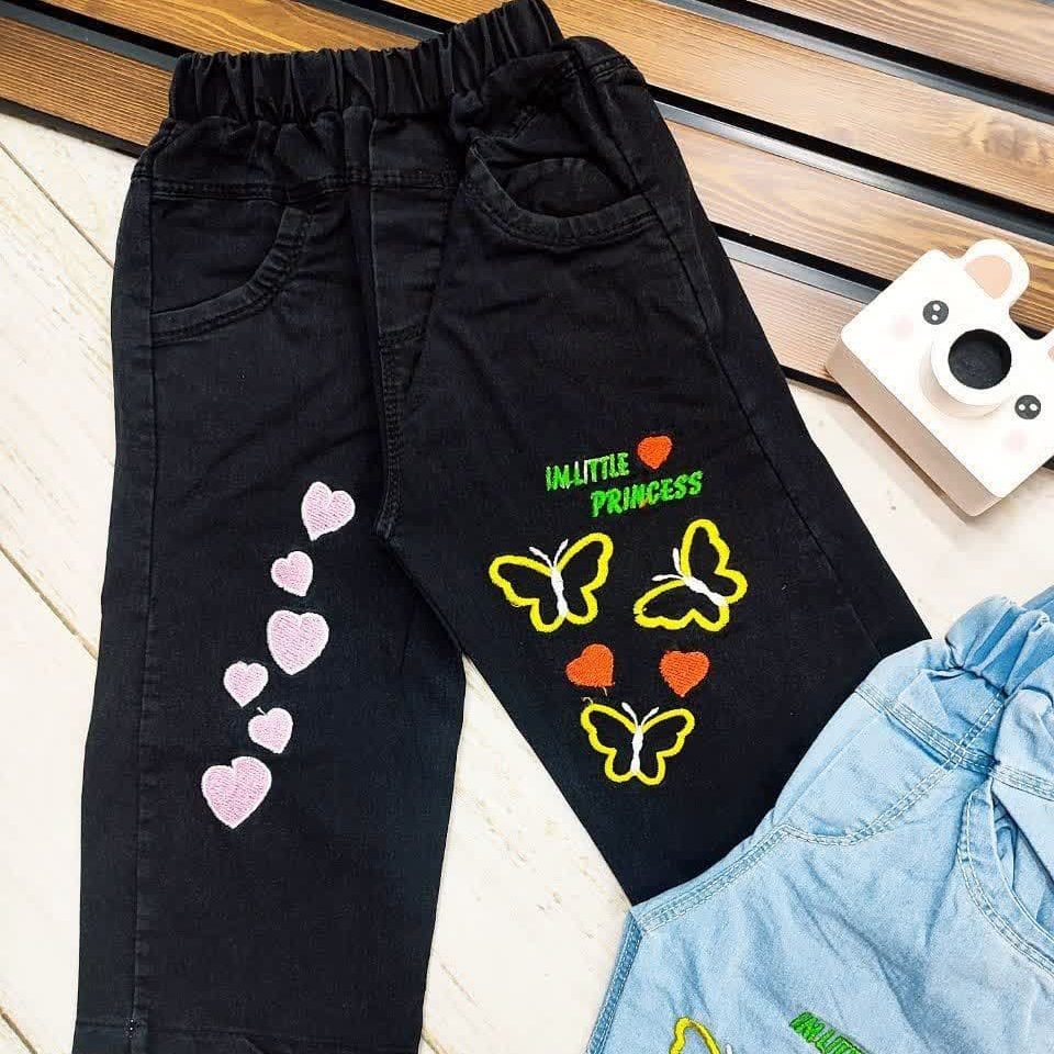 شلوارک لی کمرکش طرح گلدوزی پروانه و قلب دخترانه
